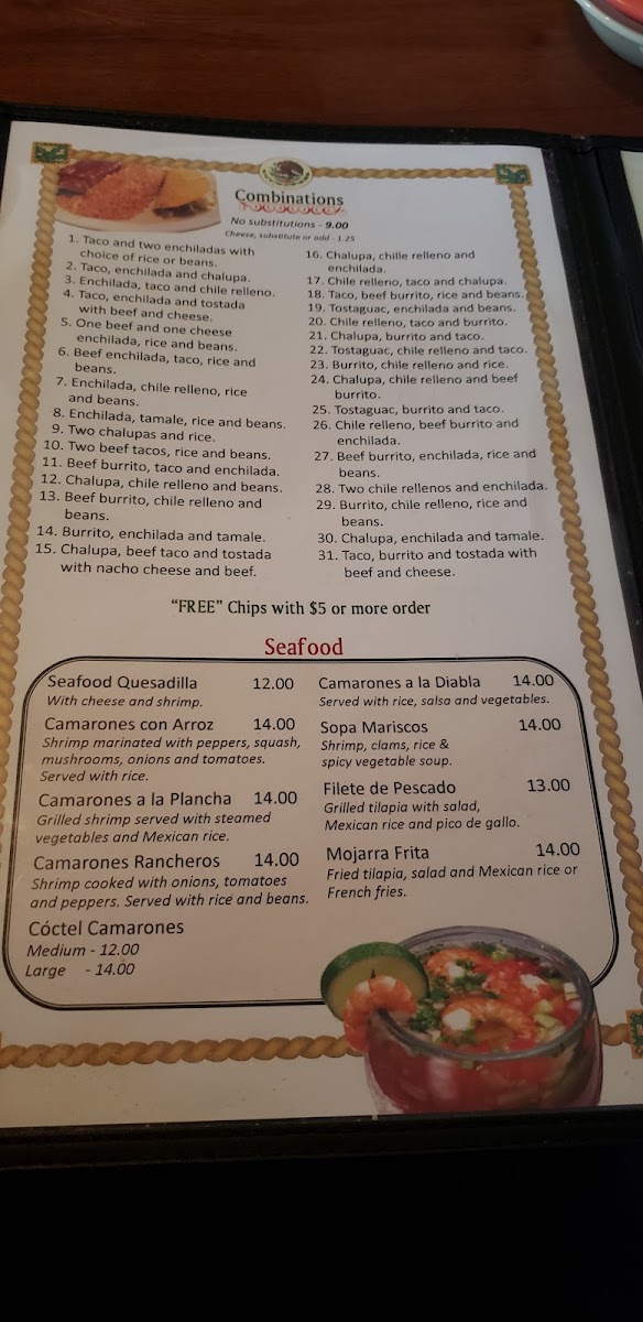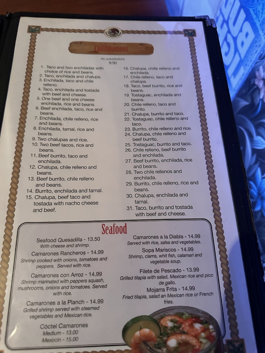 The menu showcases a variety of tempting options, starting with light and delicious appetizers like Bean Nachos and hearty Beef and Bean Nachos, perfect for sharing. For those craving a meal, the combinations are a delightful way to sample different flavors, with options including Taco, Enchilada, and Chalupa or the savory Chalupa and Burrito, all available at a reasonable price of $10.50. Each dish showcases fresh ingredients and vibrant flavors, making every bite a celebration of taste.